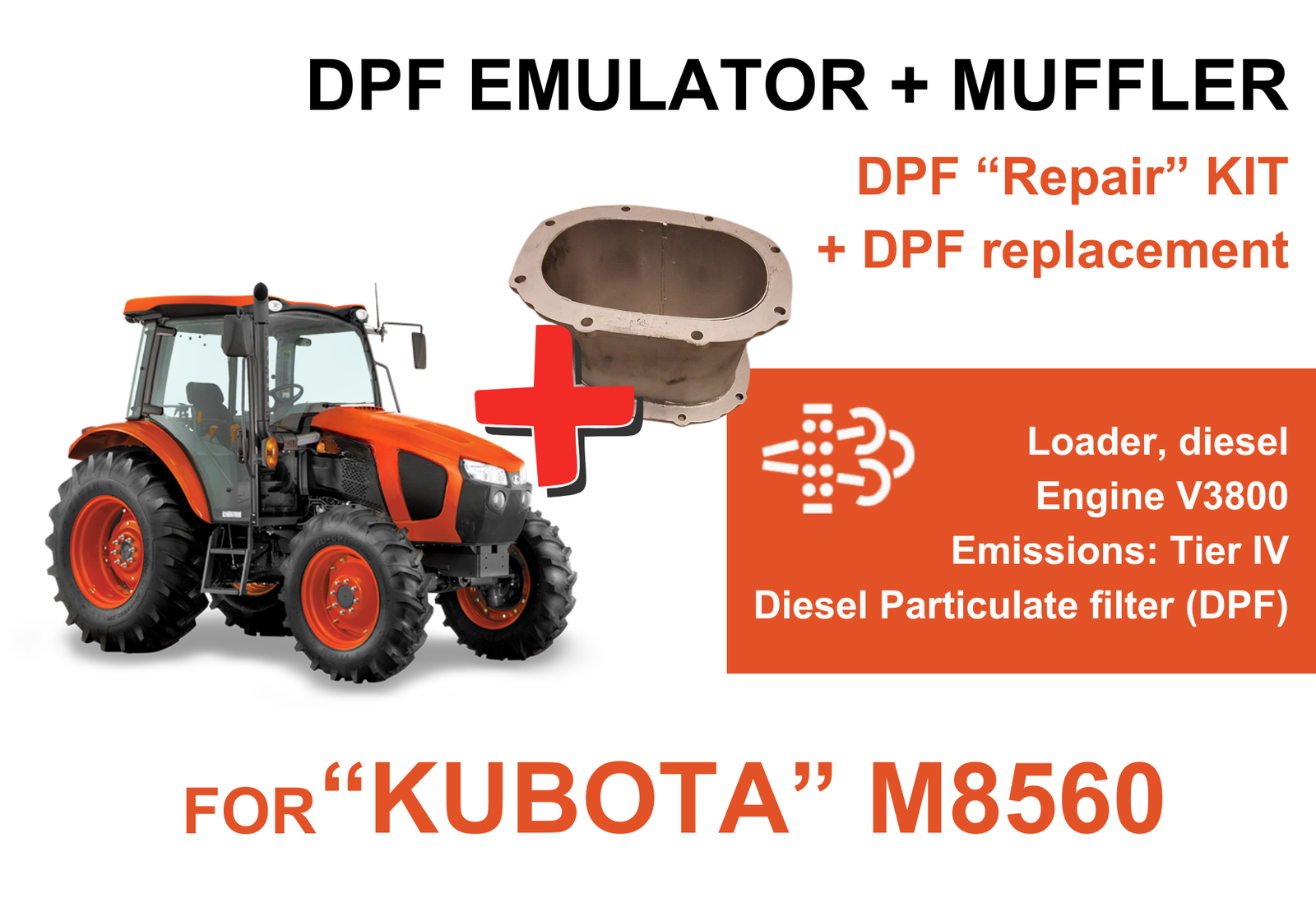Plug & Play DPF delete kit for Kubota M8560 with V3800 engine. Disables DPF system fully — no regen cycles, no errors, no derate
